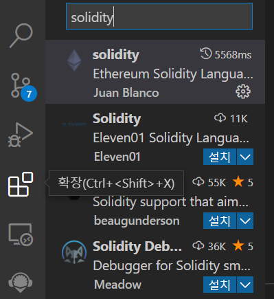 vscode 열고 Ctrl + Shift + X 누르거나 여기 누르면 솔리디티 검색해서 깔면 됨!