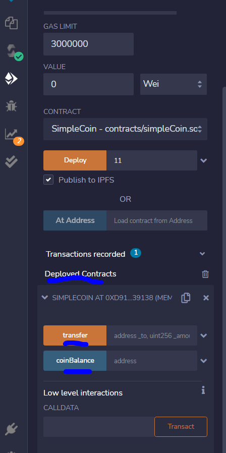 컨트랙트를 배포하면 Deployed Contracts 패널이 나타난다.