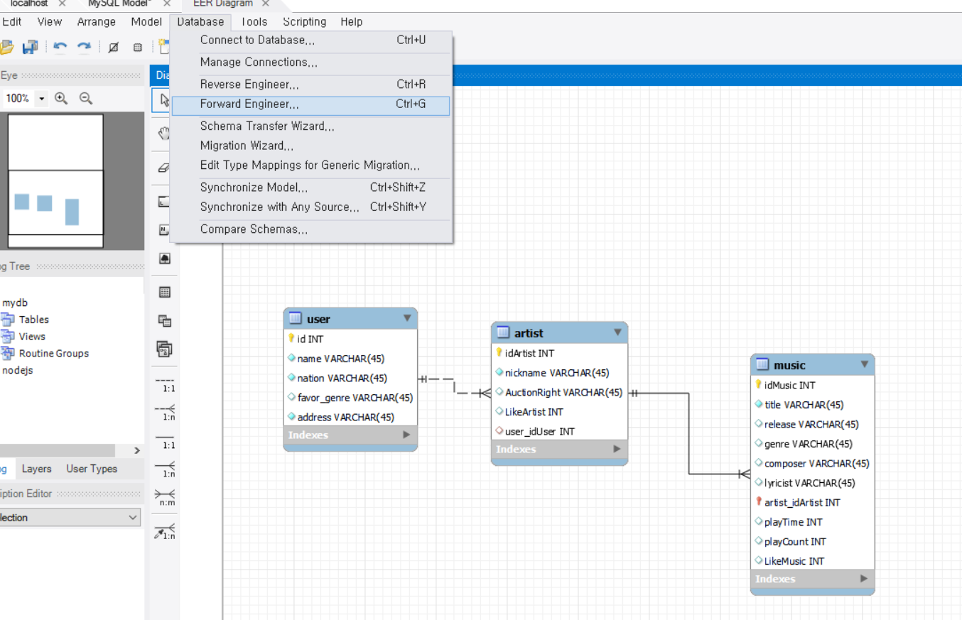 만든 다이어그램이 테이블로 생성이 된다. (Synchronize Model하면 기존에 있는 테이블을 수정하고 업데이트할 수 있다.)