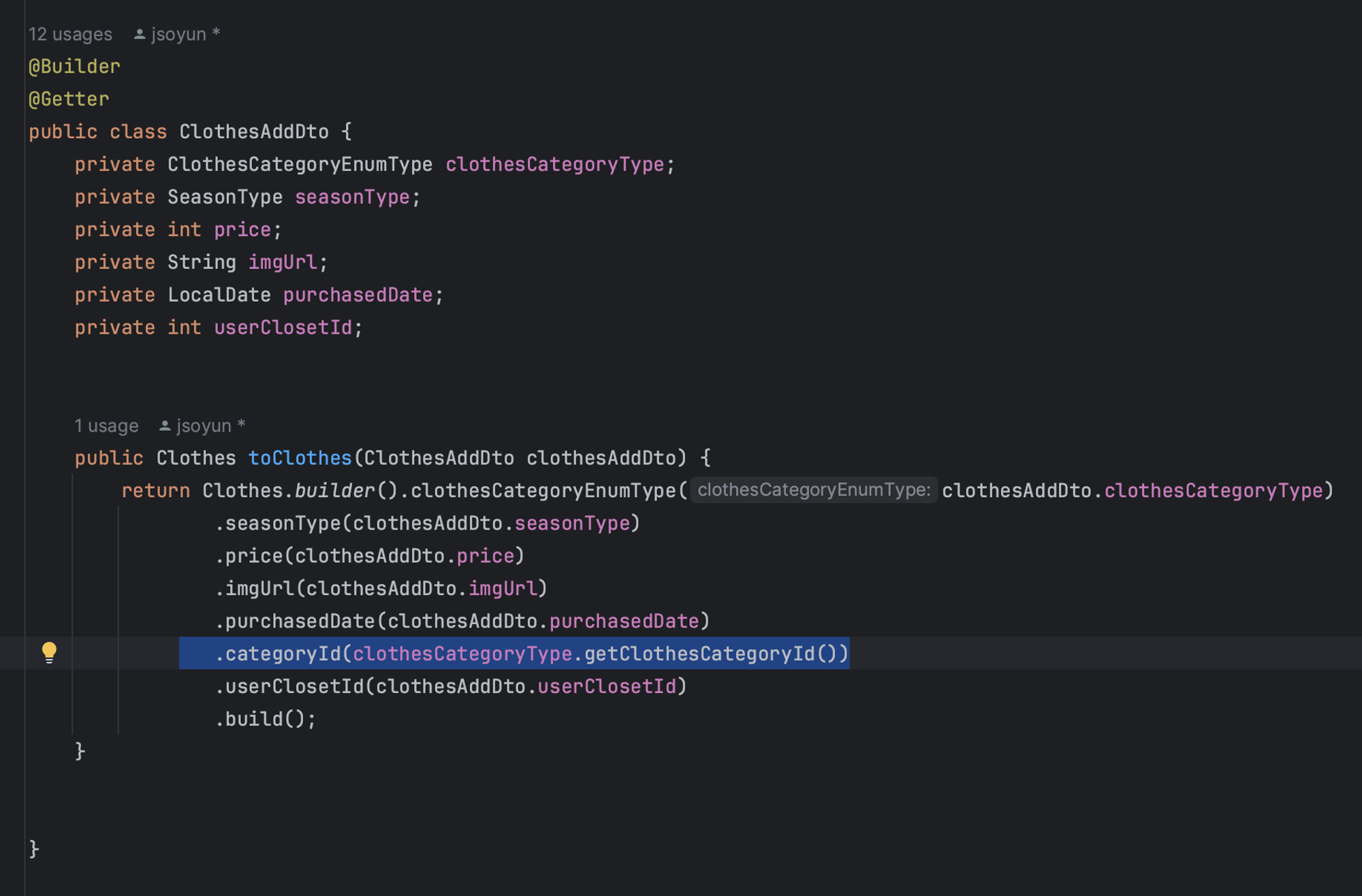 Clothes clothes = clothesAddDto.toClothes(clothesAddDto);