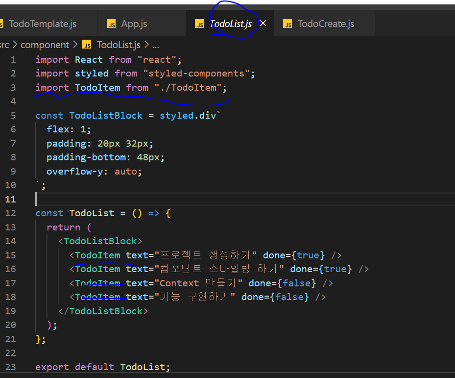 (참고로 투두리스트 시작할때 styled-component모듈 깔아도 안된다길래 뭐지 했는데