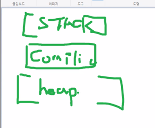 4. 힙heap 영역->사용자가 직접 관리할 수 있는,그래야하는 메모리 영역,사용자에 의해 메모리공간이 동적할당되고 해제됨. 메모리의 낮은 주소에서 높은 주소의 방향으로 할당됨.