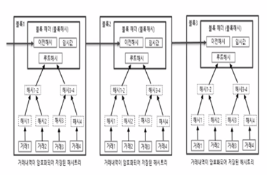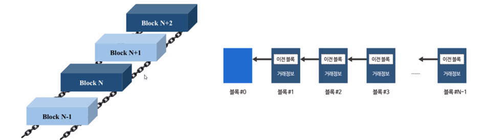 즉 여러 건의 거래내역을 하나의 블록으로 묶어 기존에 생성된 블록에 체인처럼 계속적으로 연결하는 데이터 구조를 의미합니다.