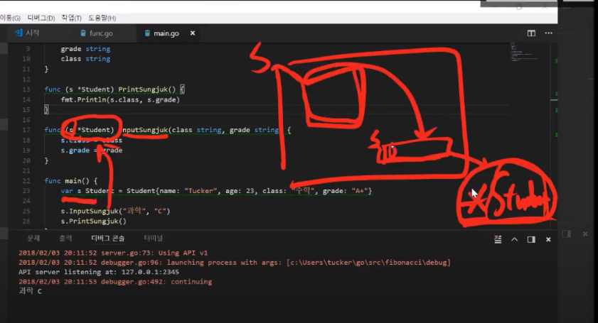 var s Student= Student{name: "t",age:23, class: "수학",grade: "A"}