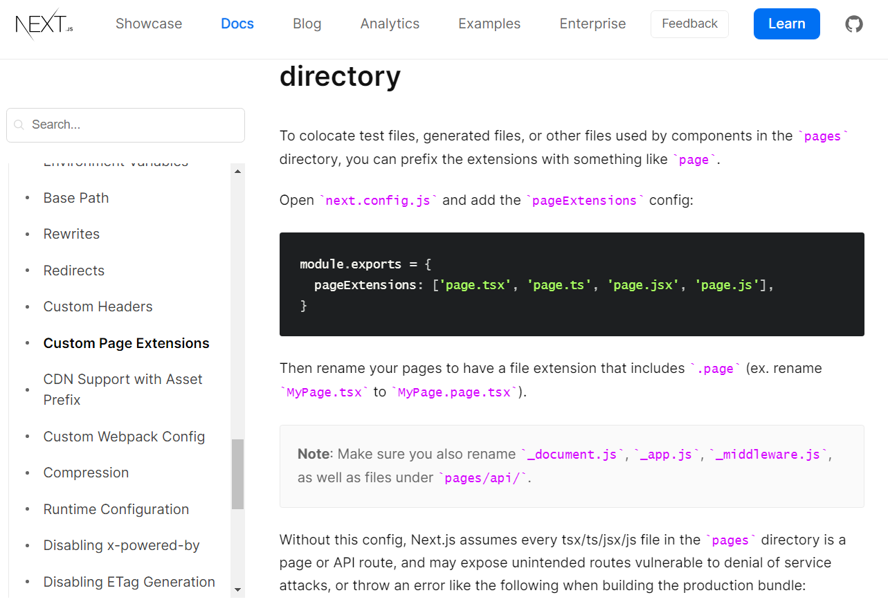 이렇게 하려면 아래와 같이 next.config.js 파일의 pageExtensions 항목을 수정하면 됩니다. 그런 다음 .page(_document.page.js, _app.page.js, index.page.js 등)를 포함하는 파일 확장자를 갖도록 페이지 구성 요소의 이름을 바꿉니다.