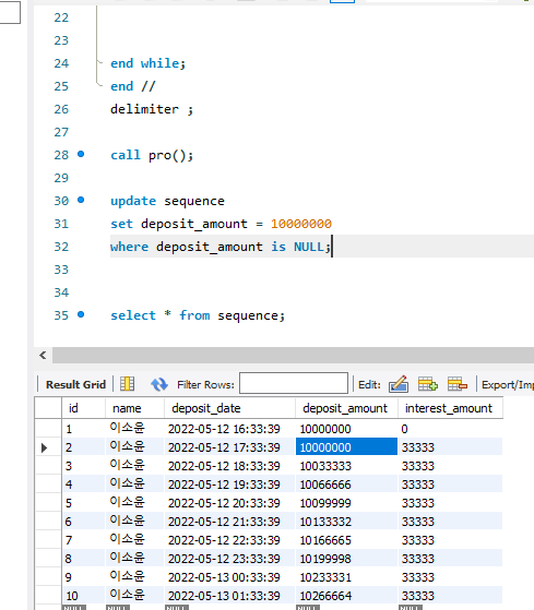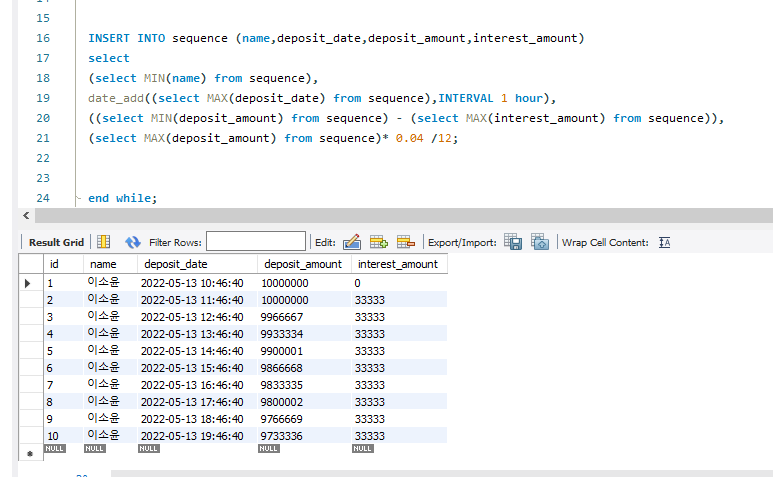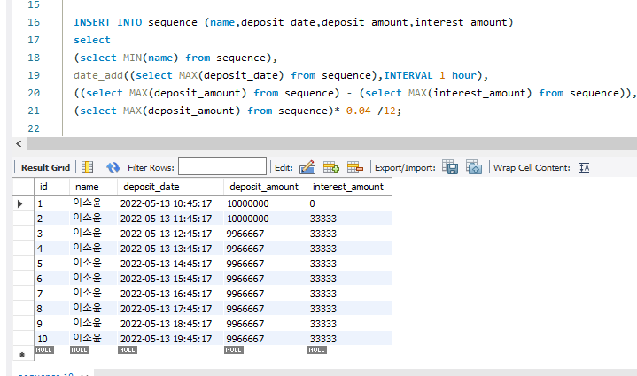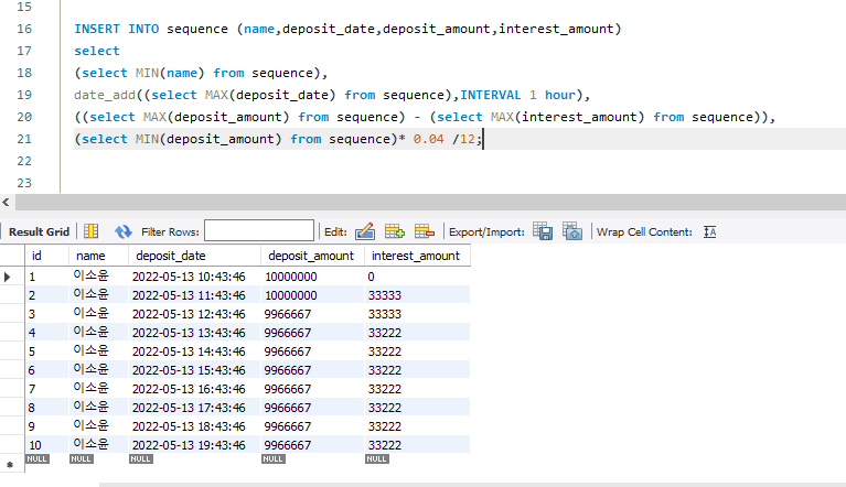 insert into sequence (name,deposit_date,deposit_amount,interest_amount) values ('이소윤',@setTime,10000000,0);