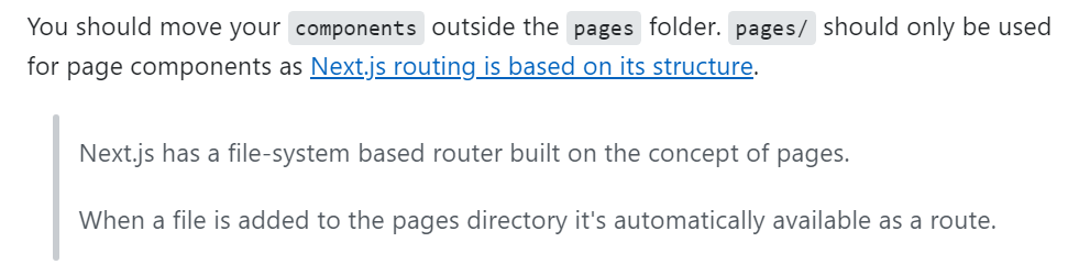 구성 요소를 페이지 폴더 외부로 이동해야 합니다. Pages/는 Next.js 라우팅이 구조를 기반으로 하므로 페이지 구성 요소에만 사용해야 합니다.