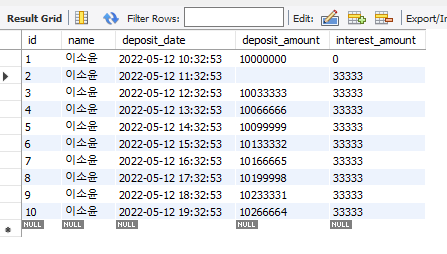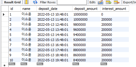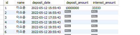 insert into testdb (name,deposit_date,deposit_amount,interest_amount) values ('이소윤',@setTime,10000000,0);