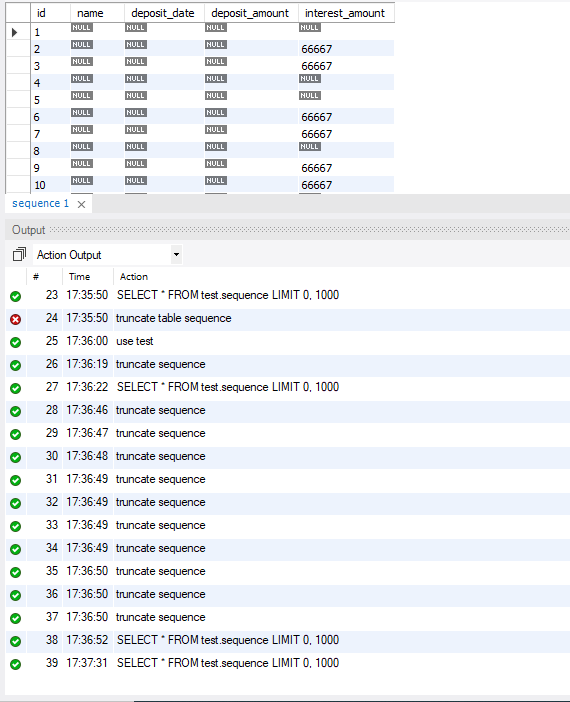SELECT * FROM test.sequence;SELECT * FROM test.sequence; truncate sequence;