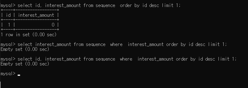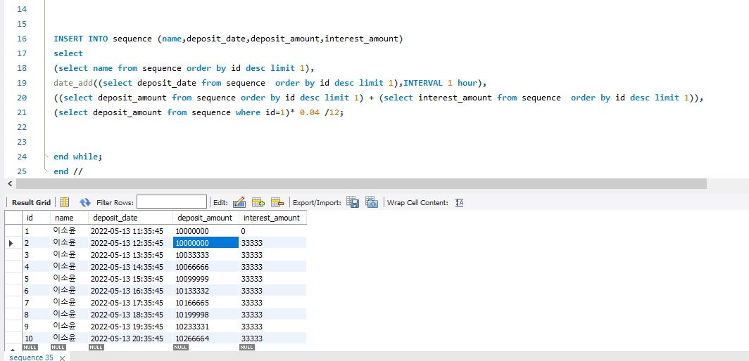 insert into sequence (interest_amount) values (증가한 이자액 넣기);