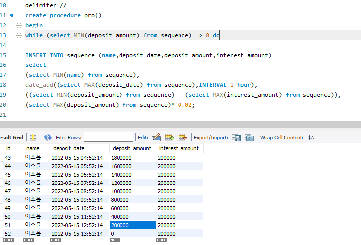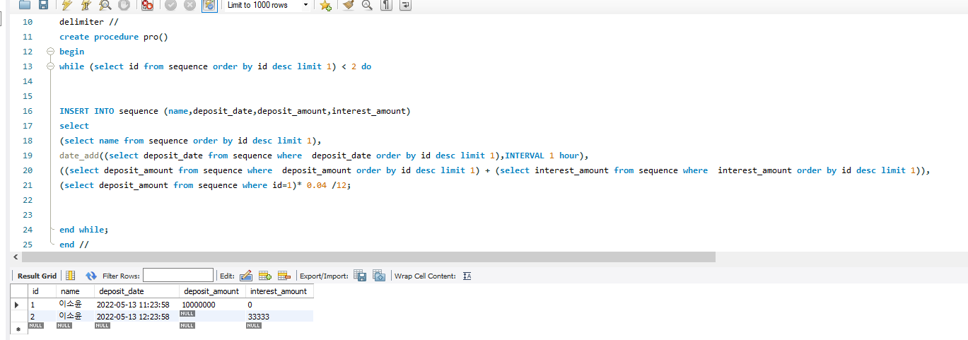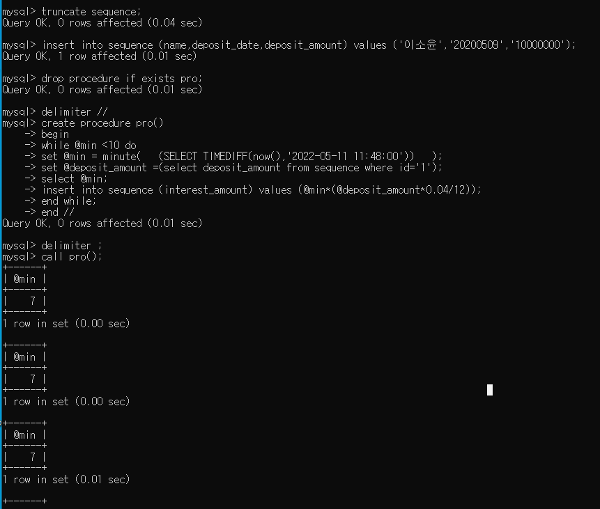 SELECT * FROM test.sequence; drop procedure if exists pro; delimiter // create procedure pro() begin while @min < 30 do set @min = minute((SELECT TIMEDIFF(now(),'2022-05-11 10:30:00'))); set @deposit_amount =(select deposit_amount from sequence where id='1'); select @min; insert into sequence (interest_amount) values (@min*(@deposit_amount*0.04/12)); end while; end // delimiter ;