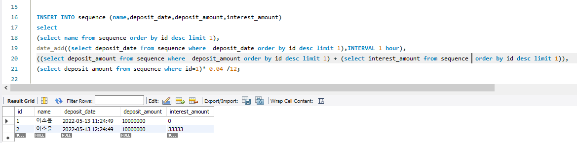INSERT INTO sequence (name,deposit_date,deposit_amount,interest_amount) select (select name from sequence order by id desc limit 1), date_add((select deposit_date from sequence where deposit_date order by id desc limit 1),INTERVAL 1 hour), ((select deposit_amount from sequence where deposit_amount order by id desc limit 1) + (select interest_amount from sequence where interest_amount order by id desc limit 1)), (select deposit_amount from sequence where id='1')* 0.04 /12;