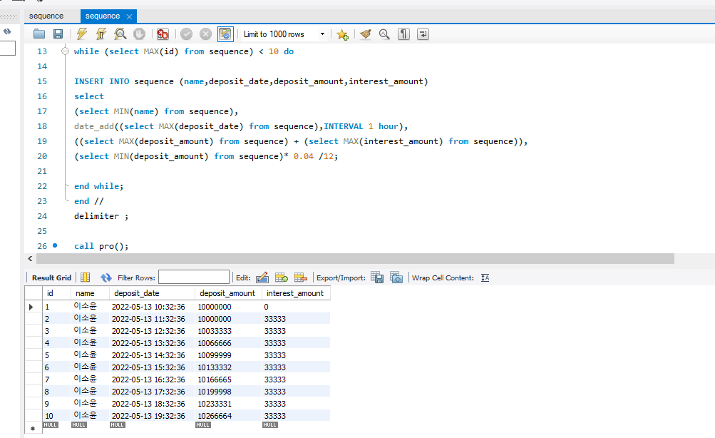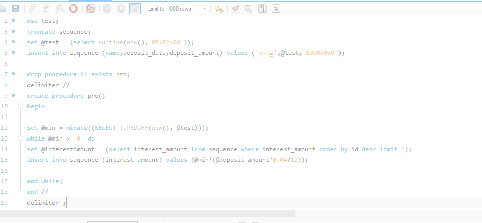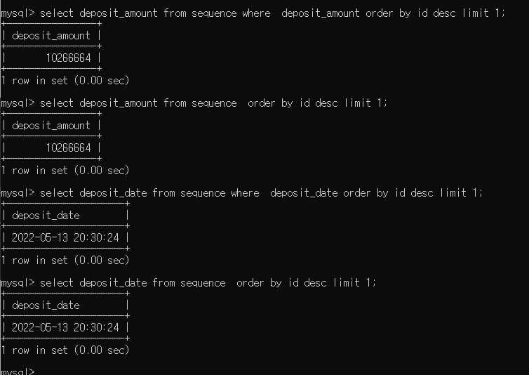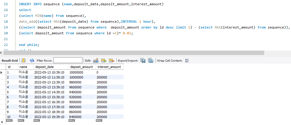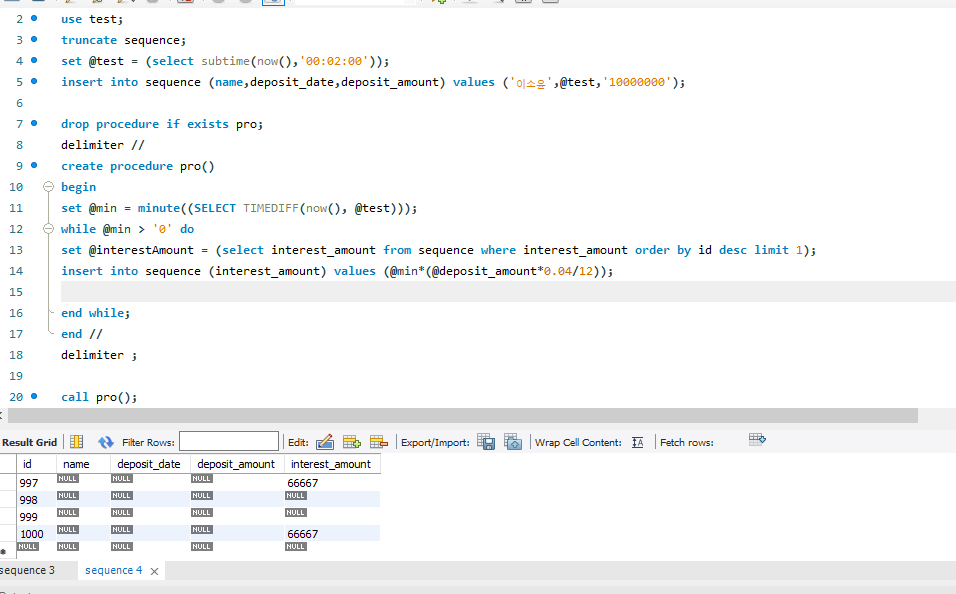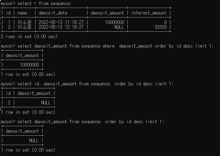 SELECT * FROM test.sequence;SELECT * FROM test.sequence; truncate sequence; set @test = (select subtime(now(),'00:02:00')); insert into sequence (name,deposit_date,deposit_amount) values ('이소윤',@test,'10000000');
