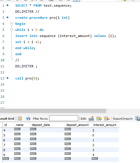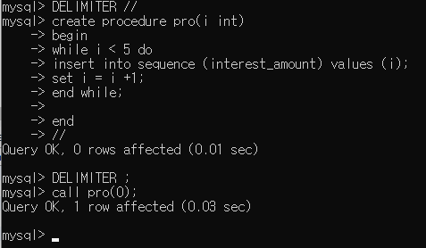 drop procedure if exists pro; delimiter // create procedure pro() begin while @min <30 do set @interestAmount = (select interest_amount from sequence);