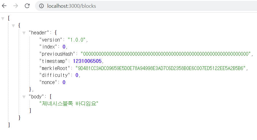 블록체인의 블록들을 넣어줄 Blocks배열을 만들고 첫번째 블록을 생성하는 함수인 createGenesisBlock함수를 해당 배열에 미리 넣어둔다.