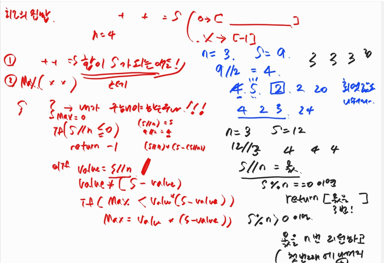 (처음에는 n이 2개라고 가정하고 식을 써봤다. 곱한 최대값을 어떻게 비교할지가 막막해서. 그런데 막상 보니까 나머지 없이 잘 나눠떨어지는 애들은 전부 집합이 몫으로 같음. 이걸보니 집합끼리 수 차이가 작을수록 모두 곱했을 때 결과가 크구나가 보였다. 기준을 몫으로 나눠떨어지는 애들 아닌애들로 처리해야함이 보였다.)